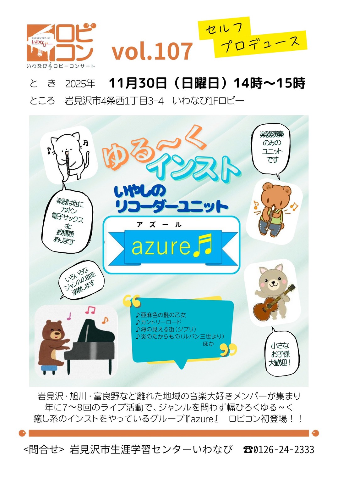 岩見沢・旭川・富良野など離れた地域の音楽大好きメンバーが集まり年に7~8回のライブ活動でジャンル問わず、幅ひろくゆるーく癒し系のインストをやっているグループ「azure」ロビコン初登場♪