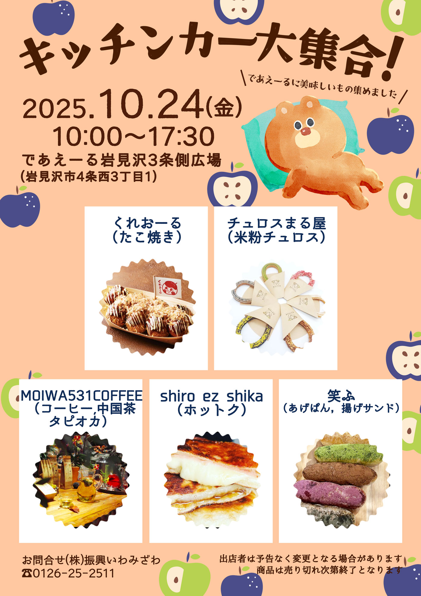 10月2回目のキッチンカー大集合!今月は『たこ焼き/チュロス/コーヒー/ホットク/あげぱん等』のたくさんの美味しい食べ物が大集合しています!ぜひ皆様のお越しをお待ちしております!会場はであえーる裏広場です!