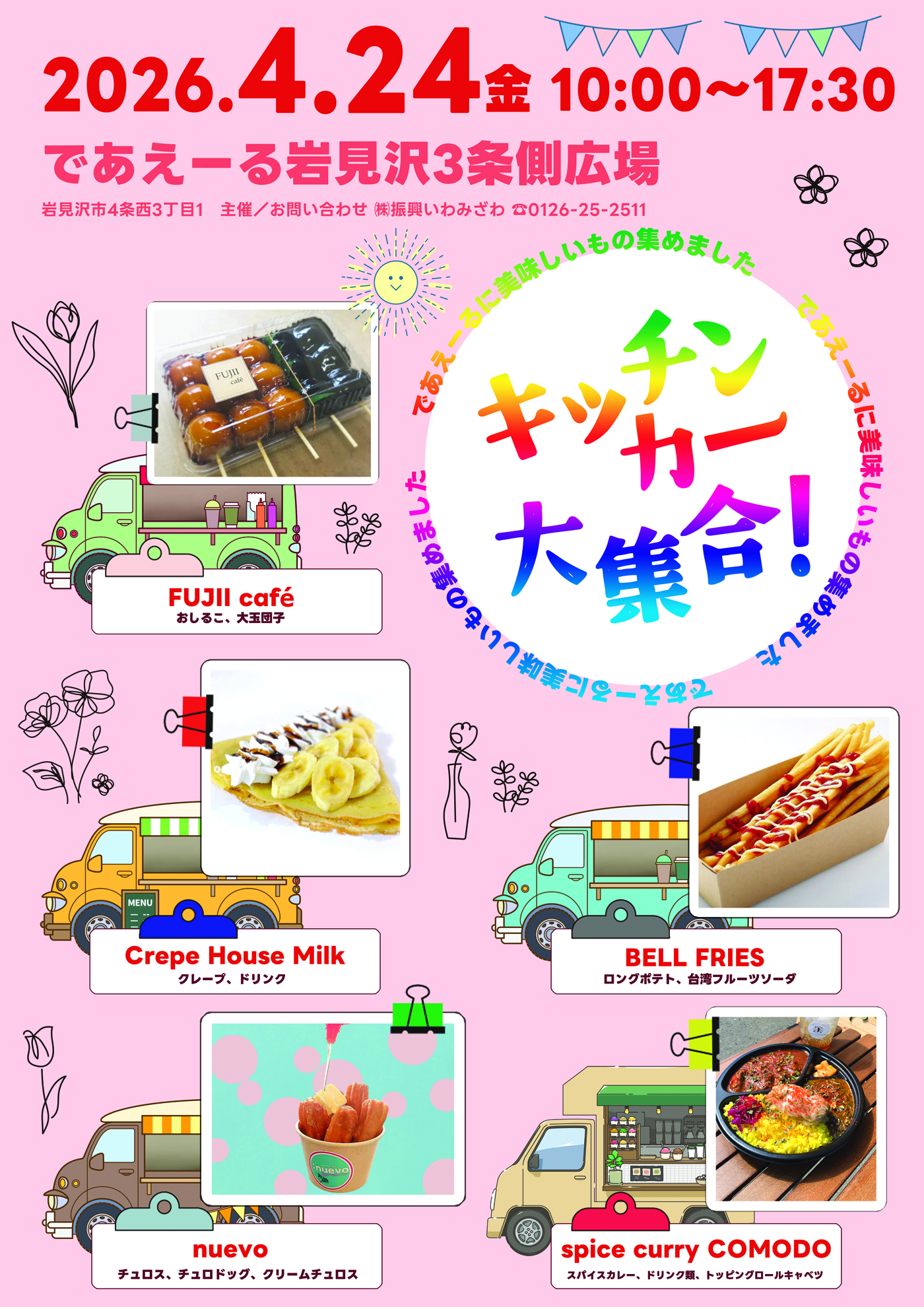 4月のキッチンカー大集合!今月の第二弾は『おしるこ/クレープ/ロングポテト/チュロス/スパイスカレー』などのたくさんの美味しい食べ物が大集合しています!ぜひ皆様のお越しをお待ちしております!会場はであえーる裏広場です!