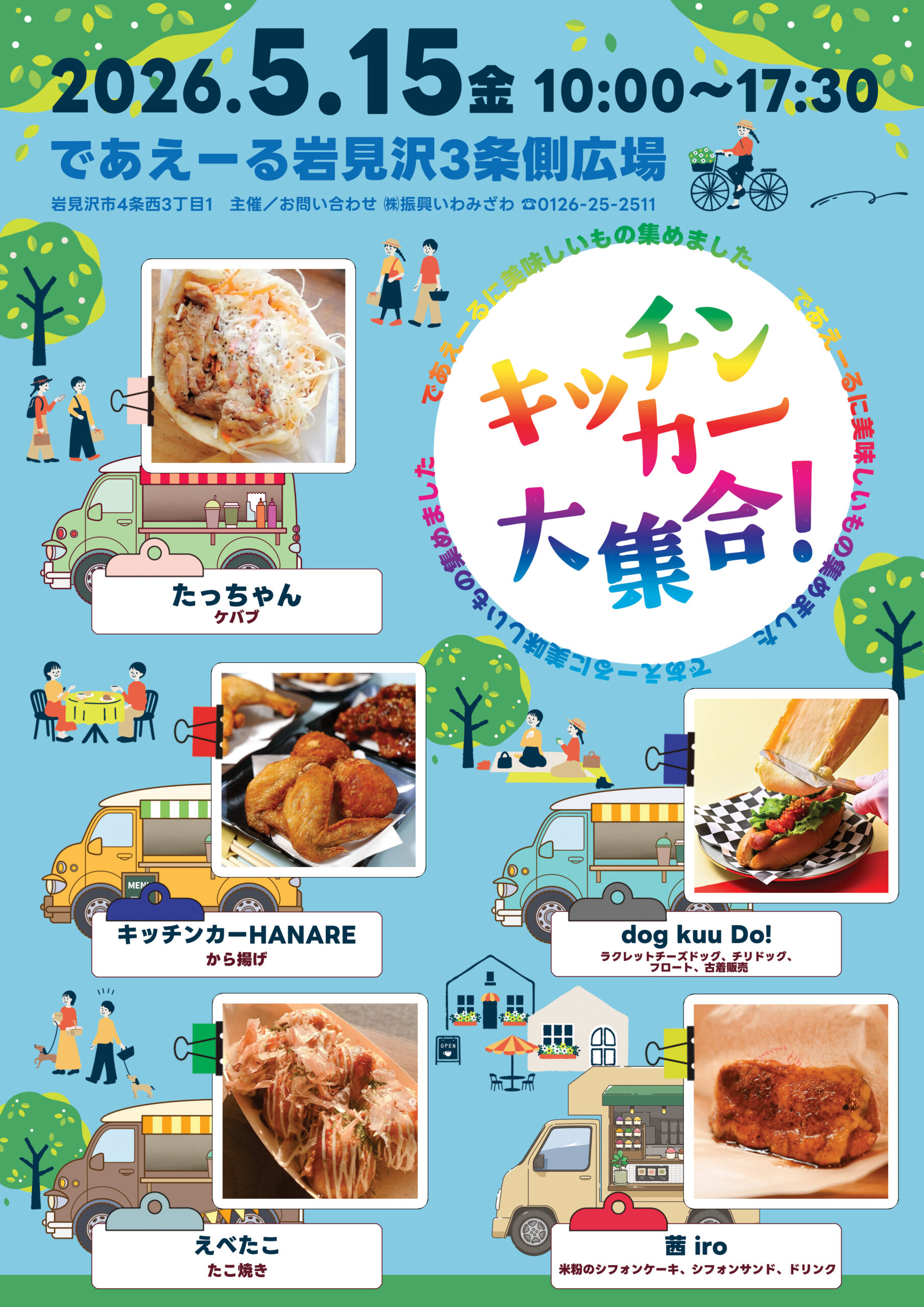 5月のキッチンカー大集合!今月は『ケバブ/唐揚げ/ラクレットチーズドッグ/たこ焼き/米粉のシフォンケーキ』などのたくさんの美味しい食べ物が大集合しています!ぜひ皆様のお越しをお待ちしております!会場はであえーる裏広場です!