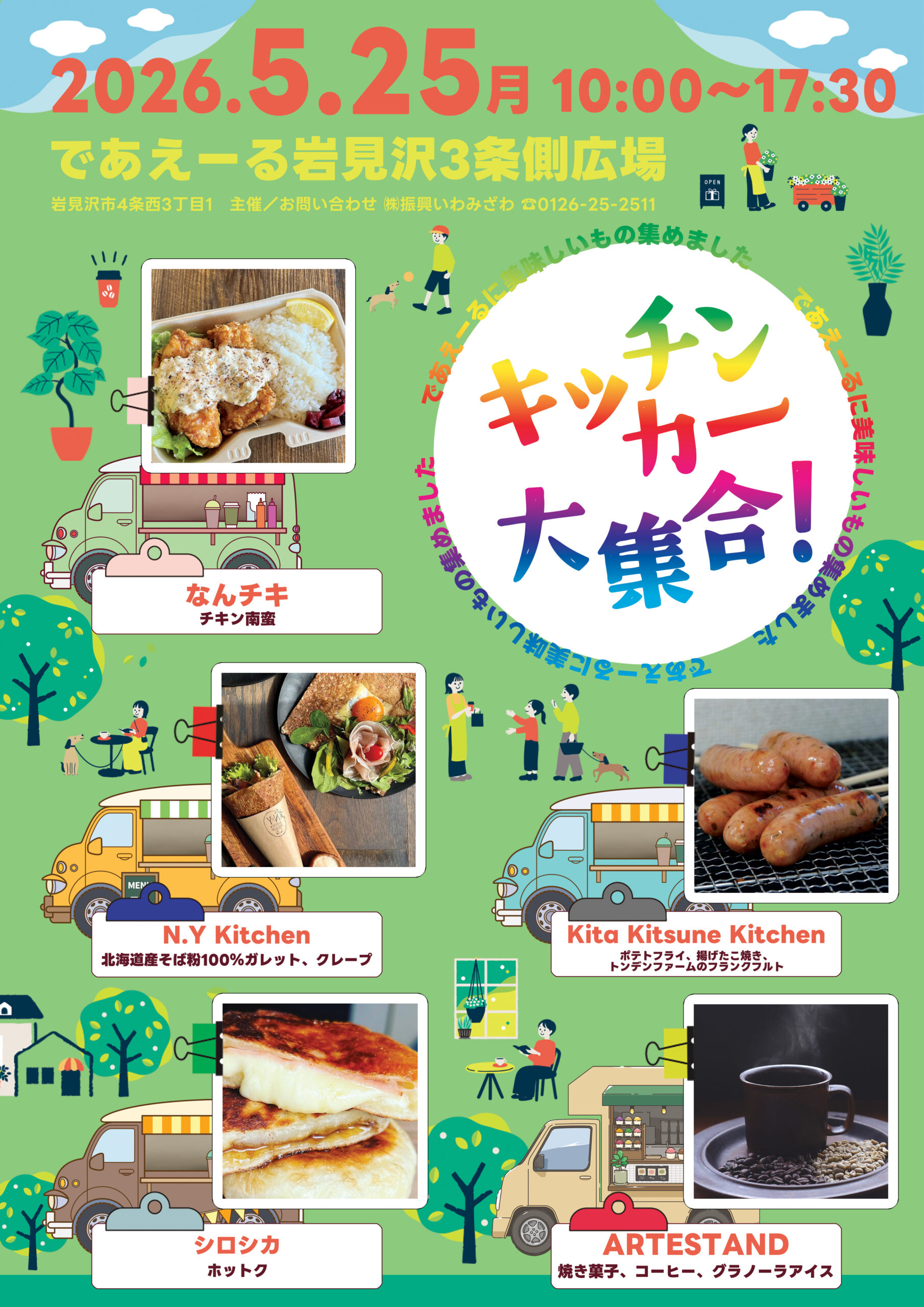 5月のキッチンカー大集合!今月は『チキン南蛮/北海道産そば粉100%ガレット/ポテトフライ/ホットク/焼き菓子』などのたくさんの美味しい食べ物が大集合しています!ぜひ皆様のお越しをお待ちしております!会場はであえーる裏広場です!