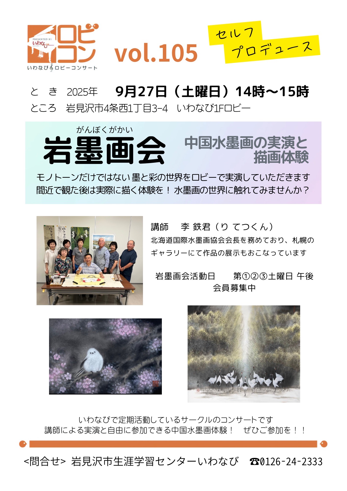 モノトーンだけではない墨と彩の世界をロビーで実演していただきます。間近で観た後は実際に描く体験を!水墨画の世界に触れてみませんか?